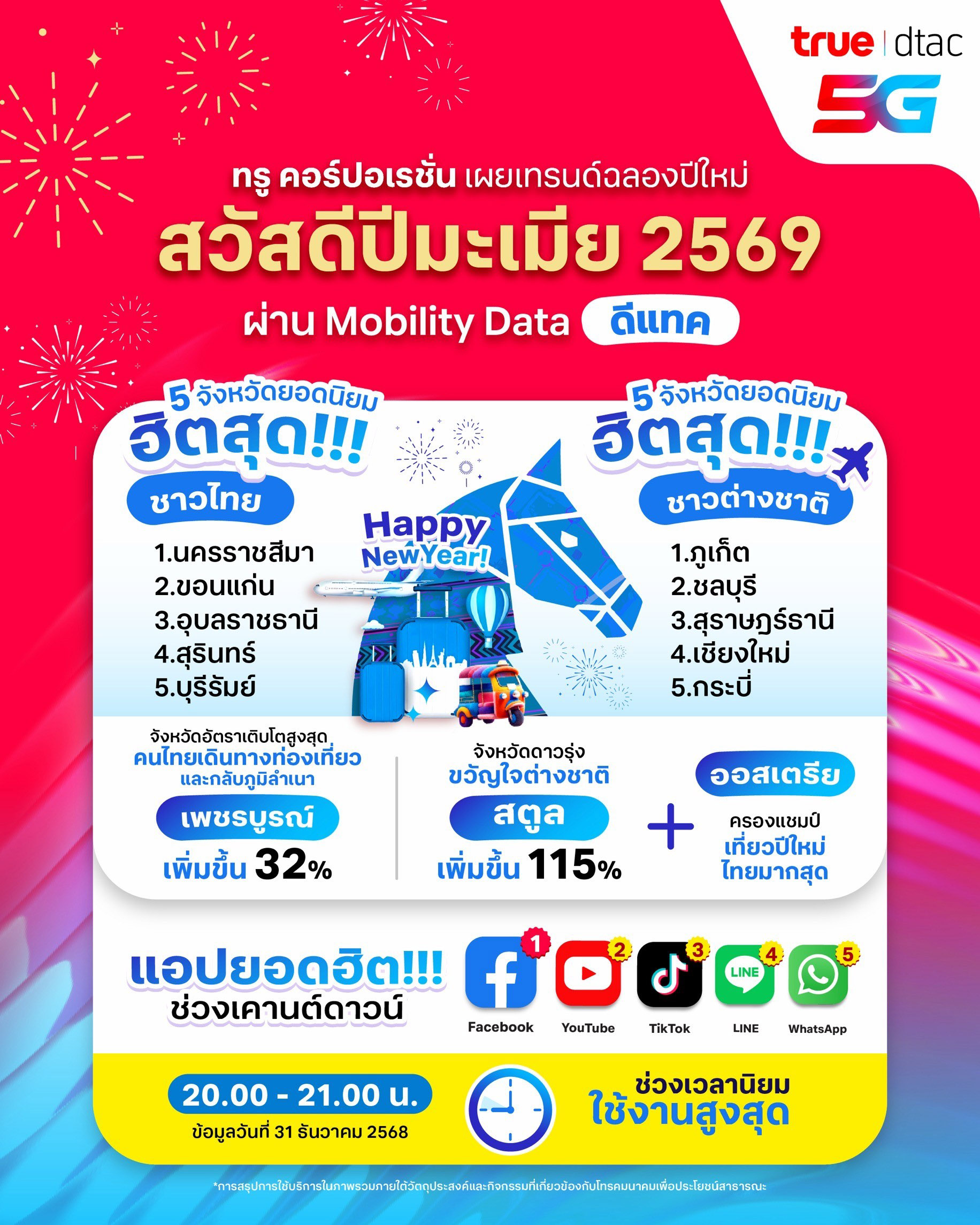 นอกจากนี้ ทรู คอร์ปอเรชั่น ได้รายงาน 5 จังหวัดท่องเที่ยวยอดนิยมของคนไทยและต่างชาติจาก Mobility Data พร้อมเผย 5 แอปพลิเคชันยอดฮิต ที่ครองการใช้งานทั้งมือถือและเน็ตบ้านในคืนข้ามปี ขณะที่แอปทรูไอดี (TrueID) มียอดผู้ใช้งานรวมในช่วงเทศกาลเพิ่มขึ้นราว 110% เมื่อเทียบกับช่วงปกติ สะท้อนบทบาทการใช้งานและความนิยมคอนเทนต์วิดีโอและเอนเตอร์เทนเมนต์ในช่วงเวลาส่งท้ายปีเก่าต้อนรับปีใหม่