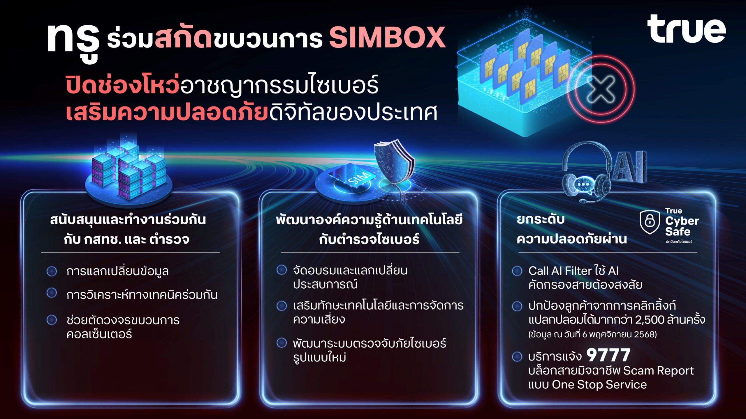 True has consistently focused on combating sophisticated and evolving online fraud schemes while enhancing customer protection through True CyberSafe, a digital security initiative offering Call AI Filter, an AI-based system that screens suspicious calls, and has blocked over 2500 million malicious link clicks (data as of November 6, 2025). In addition,True offers the “9777 Scam Report” one-stop service that allows the public to instantly block suspected scam calls, with case details seamlessly relayed to the police for prompt action. This collaboration reinforces True’s proactive and seamless partnership with all sectors, effectively blocking fraudulent calls and strengthening Thailand’s overall digital safety ecosystem.