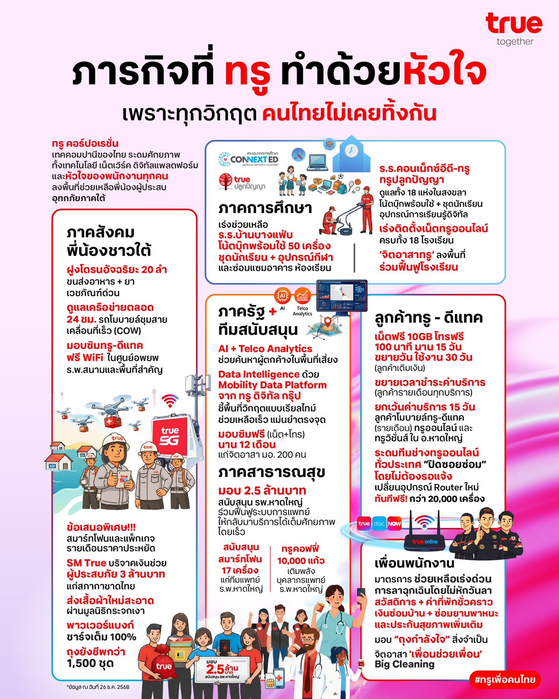 ในช่วงสถานการณ์ที่ผ่านมา ทรู ได้ดำเนิน “ภารกิจแห่งหัวใจ” เร่งฟื้นฟูและเยียวยาผู้ประสบอุทกภัยที่หาดใหญ่อย่างครอบคลุม ทั้งด้านการศึกษา คืนอนาคตเด็กไทยที่โรงเรียนบ้านบางแฟ่บและโรงเรียนเครือข่ายรวม 18 แห่ง ผ่านการมอบโน้ตบุ๊ก สื่อดิจิทัล และฟื้นฟูอาคารเพื่อให้การเรียนการสอนดำเนินการต่อได้ทันที ด้านเทคโนโลยีและนวัตกรรม นำศักยภาพ AI และ Mobility Data สนับสนุนภาครัฐวิเคราะห์พิกัดกู้ภัยและวางแผนอพยพ พร้อมส่งฝูงโดรนอัจฉริยะ 20 ลำ ขนส่งยาและอาหารในพื้นที่ที่เข้าถึงยาก ควบคู่ไปกับการรักษาเสถียรภาพเครือข่ายตลอด 24 ชั่วโมง พร้อมนำรถชุมสายเคลื่อนที่เร็ว (COW) เสริมสัญญาณในพื้นที่น้ำท่วม ด้านการดูแลลูกค้า ยกเว้นค่าบริการสำหรับลูกค้ามือถือ ทรูออนไลน์ และทรูวิชั่นส์ พร้อมขยายวันใช้งานและขยายเวลาชำระค่าบริการ มอบซิมทรู–ดีแทค และ WiFi ฟรี ในศูนย์อพยพ รพ.สนาม ทั้งยังระดมช่างทรูออนไลน์จากทั่วประเทศทำภารกิจ “ปิดซอยซ่อม” ลงพื้นที่เปลี่ยนอุปกรณ์โมเด็มถึงบ้านลูกค้าครบ 100% โดยไม่ต้องรอให้ลูกค้าแจ้ง ตลอดจนส่งต่อกำลังใจผ่านการบริจาคเงินและถุงยังชีพ นอกจากนี้ยังสนับสนุนบุคลากรทางการแพทย์และผู้ทำงานด้านสาธารณสุขด้วยส่วนลดสมาร์ทโฟนและแพ็กเกจราคาพิเศษ เพื่อเป็นพลังสำคัญในการขับเคลื่อนให้หาดใหญ่กลับมาเข้มแข็งอีกครั้ง