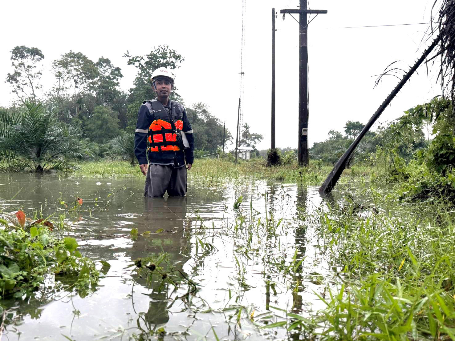 บรรยายภาพ: เจ้าหน้าที่ทีมเน็ตเวิร์กทรูเข้าตรวจสอบสถานีฐานในพื้นที่น้ำท่วม อ.ทุ่งสง จ.นครศรีธรรมราช เพื่อซ่อมสายไฟเบอร์ที่เป็นเส้นหลักสำหรับเชื่อมจากเสาสัญญาณไปยังโครงข่ายใหญ่ของจังหวัด เพื่อประชาชนใช้งานมือถือและเน็ตบ้านได้ต่อเนื่องตามปกติแม้อยู่ในสถานการณ์น้ำท่วมหนักหลายพื้นที่