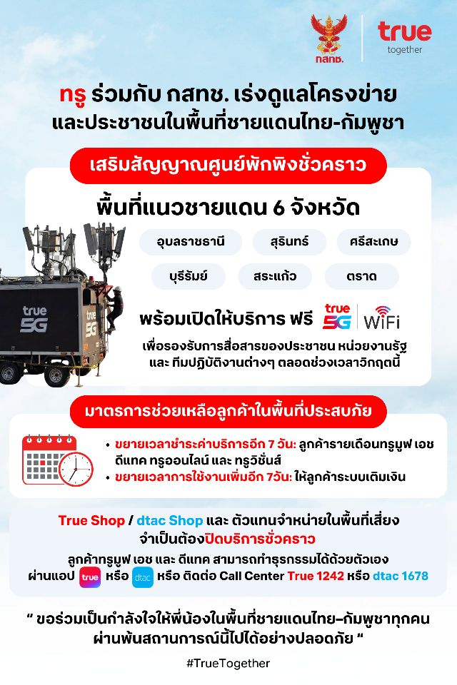 ทรูและดีแทคขอร่วมเป็นกำลังใจให้พี่น้องในพื้นที่ชายแดนไทย–กัมพูชาทุกคน ผ่านพ้นสถานการณ์นี้ไปได้อย่างปลอดภัย