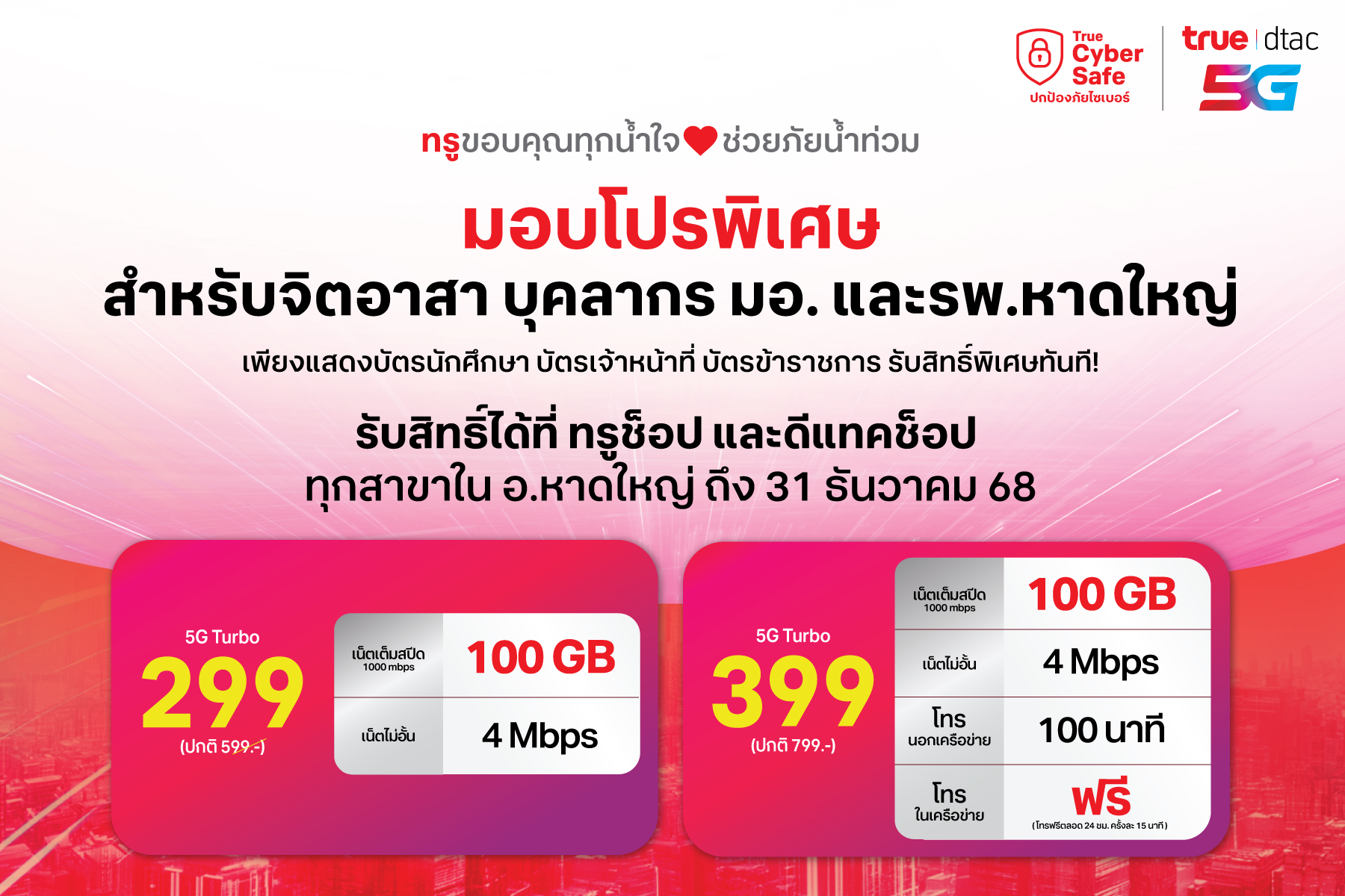 กรุงเทพฯ 4 ธันวาคม 2568 – หลังสถานการณ์น้ำท่วมใหญ่ที่ส่งผลกระทบต่อชุมชนในอำเภอหาดใหญ่และจังหวัดสงขลาอย่างหนัก ทรู ดีแทค ขอเป็นอีกหนึ่งพลังเล็กๆ ร่วมส่งต่อกำลังใจ ภายใต้แนวคิด “น้ำท่วมจากไป น้ำใจคงอยู่” พร้อมช่วยแบ่งเบาภาระด้านการสื่อสาร ซึ่งเป็นสิ่งจำเป็นในช่วงเวลายากลำบาก ด้วยข้อเสนอพิเศษทั้งสมาร์ทโฟนและแพ็กเกจรายเดือนในราคาประหยัด เพื่อช่วยลดภาระค่าใช้จ่ายและทำให้ทุกคนยังคงออนไลน์ได้อย่างต่อเนื่อง