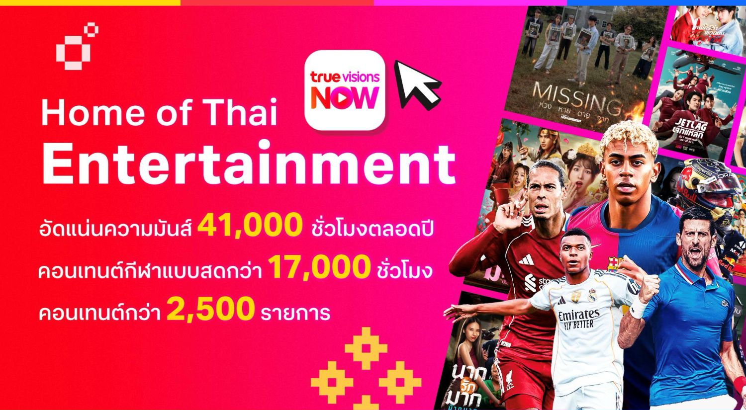 ทรูวิชั่นส์ นาว เดินหน้ายกระดับความบันเทิงไทยสู่มาตรฐานสากล ผนึกกำลังพันธมิตรและสตูดิโอชั้นนำทั่วไทย สร้างสรรค์ความบันเทิงที่ “รู้ใจ” และ “เข้าถึง” อารมณ์คนไทยอย่างแท้จริง ครอบคลุมตั้งแต่การผลิต Thai Originals คุณภาพระดับสากลหลากหลายรูปแบบตลอดทั้งปี เรียลลิตี้ชั้นนำ สุดยอดคอนเทนต์กีฬาระดับโลก รวมถึงการถ่ายทอดสดมวยไทยมากที่สุดในประเทศไทยเอกสิทธิ์เฉพาะลูกค้าทรูวิชั่นส์ นาวเท่านั้น พร้อมเสริมความแข็งแกร่งด้านไลฟ์สไตล์ด้วยการจับมือกับ 6 แบรนด์คอนเทนต์ระดับสากล และยกระดับประสบการณ์การรับชมผ่าน แอปพลิเคชัน ทรูวิชั่นส์ นาว โฉมใหม่ มั่นใจว่าทุกก้าวสำคัญเหล่านี้จะช่วยส่งมอบความสุขและความสนุกให้ผู้ชมอย่างต่อเนื่องในทุกวัน